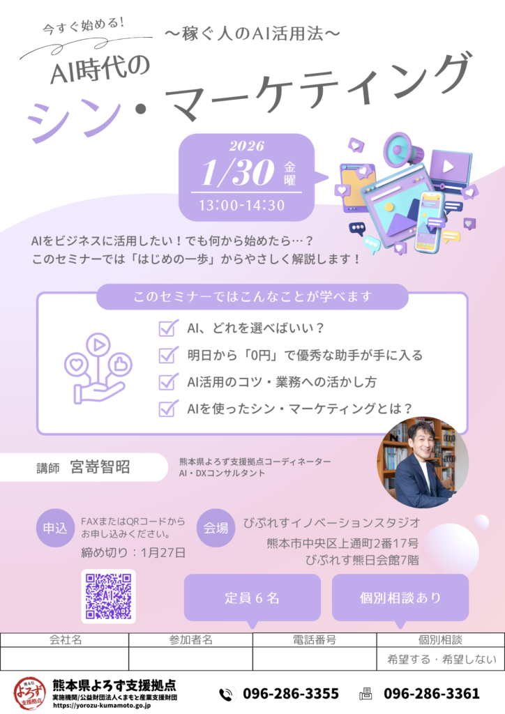 【経営実践セミナー】AI時代のシン・マーケティング(2026年1月30日開催) 2025.12.26インフォメーション, セミナー情報 HOME ブログ インフォメーション , セミナー情報 【経営実践セミナー】AI時代のシン・マーケティング(2026年1月30日開催) Tweet Share Hatena Pocket RSS feedly Pin it AIをビジネスに活用したい!でも何から始めたら…?このセミナーでは「はじめの一歩」からやさしく解説します! ニュースでよく聞くAI。実は、専門知識がなくても、誰でも簡単にビジネスに活かせることをご存知ですか? 「何から始めればいいかわからない」というあなたのために、明日から使えるコツをやさしく解説します。 共有:シェアFacebook お申し込みはページ下部のWEBフォームよりお申し込みください。 ↓↓↓↓↓↓ 共有:シェアFacebook 貴社名 (必須) 業種 (必須) 役 職 お名前フリガナ (必須) お名前 (必須) 電 話 (必須) メールアドレス (必須) メールアドレス (確認) このセミナーをどちらで知りましたか? 当拠点ホームページFacebookInstagram講師の案内友人/知人新聞その他 個別相談 (必須) 希望しない希望する※セミナー後に個別相談の時間を設けておりますが時間の都合で後日となる場合もございます。ご了承ください。 ※またご相談については個人事業主様、中小企業様に限ります。ご了承ください 連絡事項 【利用目的】セミナーの開催に関する準備や連絡のため (個別相談をご希望の方は、その後の相談対応の連絡や相談記録作成) 【提供等】本セミナーの運営は第三者に委託しておりません。 当拠点の事業は、中小企業庁(委託契約先は九州経済産業局)からの委託を受けて実施しておりますので、求めに応じて、中小企業庁や九州経済産業局に参加者情報を提供する場合があります。 【取扱いに関する苦情相談先】(公財)くまもと産業支援財団 総務部長(096-286-3311) 熊本県よろず支援拠点利用についての確認事項 熊本県よろず支援拠点利用についての確認事項及び個人情報の取り扱いについて了承しました (必須) 送信前に、再度内容に間違いがないかご確認ください。 Δ 共有:シェアFacebook 共有:シェアFacebookいいね:いいね 読み込み中… Tweet Share Hatena Pocket RSS feedly Pin it 投稿者: 宮嵜智昭 インフォメーション, セミナー情報 コメント: 0 【経営実践セミナー】写真で作るSNSリール動画(2026年1月26日開催) コメント ( 0 ) トラックバックは利用できません。 この記事へのコメントはありません。 関連記事一覧 持続化給付金申請要領(法人版) 2020.04.28インフォメーション, コーディネーターブログ, 補助金・助成金・その他金融支援情報等 【終了】売上・経費管理方法のセミナー&個別相談会 2021.09.15インフォメーション, セミナー情報 農業従事者に補助金 2020.06.29インフォメーション, コーディネーターブログ 大雪に関する緊急発表 2023.01.24インフォメーション