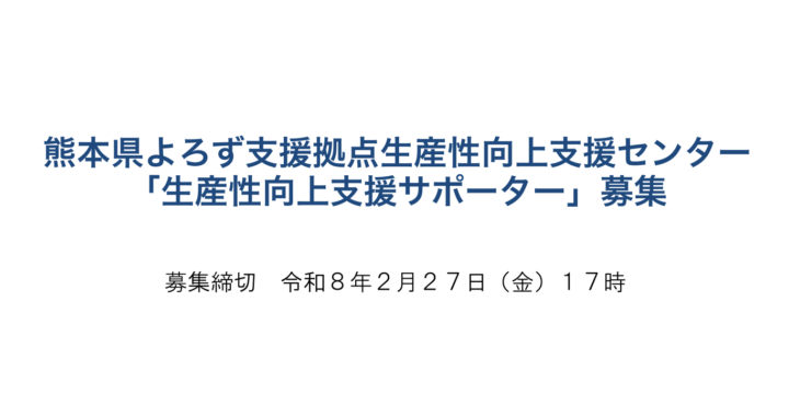 熊本県よろず支援所点(実施機関:くまもと産業支援財団)では、熊本県内の中小企業・小規模事業者の皆様が抱える売上拡大や経営改善のご相談にワンストップでお応えしております。この度、令和8年4月から当拠点内に設置される生産性向上支援センターにおいて従事していただく、「生産性向上支援サポーター」を募集します。