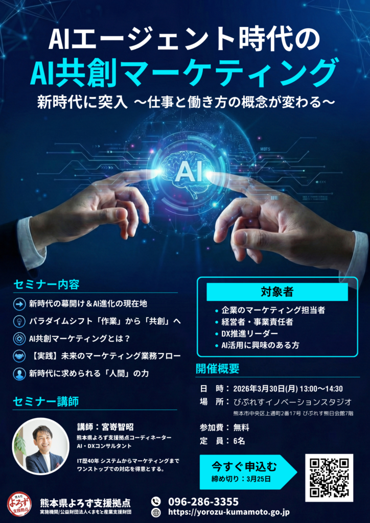 【経営実践セミナー】AIエージェント時代のAI共創マーケティング(2026年3月30日開催) 2026.02.24インフォメーション, セミナー情報 HOME ブログ インフォメーション , セミナー情報 【経営実践セミナー】AIエージェント時代のAI共創マーケティング(2026年3月30日開催) Tweet Share Hatena Pocket RSS feedly Pin it AIは「使う」から「共に創る」時代へ! 新時代に突入し、私たちの仕事と働き方の概念が大きく変わろうとしています 。単なる「作業」から、AIとの「共創」へとパラダイムシフトが起きている今、未来のマーケティングはどう変わるのでしょうか? お申し込みはページ下部のWEBフォームよりお申し込みください。 ↓↓↓↓↓↓ 共有:シェアFacebook 貴社名 (必須) 業種 (必須) 役 職 お名前フリガナ (必須) お名前 (必須) 電 話 (必須) メールアドレス (必須) メールアドレス (確認) このセミナーをどちらで知りましたか? 当拠点ホームページFacebookInstagram講師の案内友人/知人新聞その他 個別相談 (必須) 希望しない希望する※セミナー後に個別相談の時間を設けておりますが時間の都合で後日となる場合もございます。ご了承ください。 ※またご相談については個人事業主様、中小企業様に限ります。ご了承ください 連絡事項 【利用目的】セミナーの開催に関する準備や連絡のため (個別相談をご希望の方は、その後の相談対応の連絡や相談記録作成) 【提供等】本セミナーの運営は第三者に委託しておりません。 当拠点の事業は、中小企業庁(委託契約先は九州経済産業局)からの委託を受けて実施しておりますので、求めに応じて、中小企業庁や九州経済産業局に参加者情報を提供する場合があります。 【取扱いに関する苦情相談先】(公財)くまもと産業支援財団 総務部長(096-286-3311) 熊本県よろず支援拠点利用についての確認事項 熊本県よろず支援拠点利用についての確認事項及び個人情報の取り扱いについて了承しました (必須) 送信前に、再度内容に間違いがないかご確認ください。 Δ 共有:シェアFacebook 共有:シェアFacebookいいね:いいね 読み込み中… Tweet Share Hatena Pocket RSS feedly Pin it 投稿者: 宮嵜智昭 インフォメーション, セミナー情報 コメント: 0 「SNSやチラシが変わる!生成AI活用セミナー」(3月25日開催) コメント ( 0 ) トラックバックは利用できません。 この記事へのコメントはありません。 関連記事一覧 市町村経営相談会(新型コロナウイルス対応)開催中 2020.08.18インフォメーション, セミナー情報, 経営相談会 【経営実践セミナー】(9/8開催)小さいけれど強い!儲けを生... 2025.08.05インフォメーション, セミナー情報 【経営実践セミナー】事業者WEB担当のためのホームページの考... 2024.02.21インフォメーション, セミナー情報 【事業承継 特別相談会】開催のお知らせ(11月25日) 2025.11.07インフォメーション, セミナー情報, 事務局ブログ, 経営相談会
