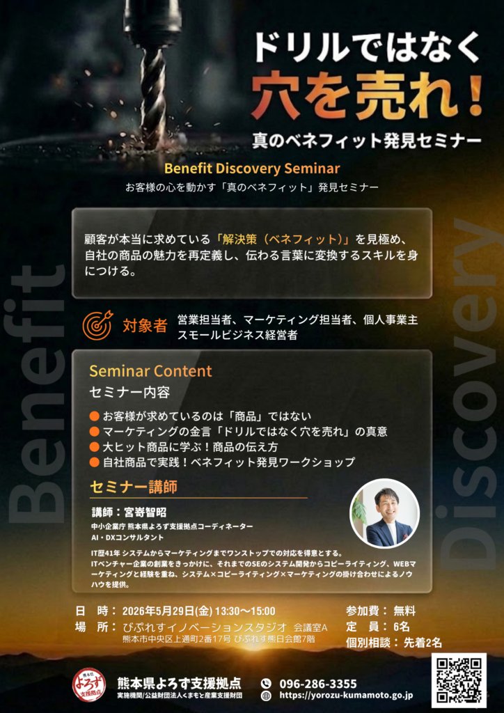 【経営実践セミナー】ドリルではなく穴を売れ!真のベネフィット発見セミナー 2026.04.16インフォメーション, セミナー情報 HOME ブログ インフォメーション , セミナー情報 【経営実践セミナー】ドリルではなく穴を売れ!真のベネフィット発見セミナー Tweet Share Hatena Pocket RSS feedly Pin it お申し込みはページ下部のWEBフォームよりお申し込みください。 ↓↓↓↓↓↓ 共有:シェアFacebook 貴社名 (必須) 業種 (必須) 役 職 お名前フリガナ (必須) お名前 (必須) 電 話 (必須) メールアドレス (必須) メールアドレス (確認) このセミナーをどちらで知りましたか? 当拠点ホームページFacebookInstagram講師の案内友人/知人新聞その他 個別相談 (必須) 希望しない希望する※セミナー後に個別相談の時間を設けておりますが時間の都合で後日となる場合もございます。ご了承ください。 ※またご相談については個人事業主様、中小企業様に限ります。ご了承ください 連絡事項 【利用目的】セミナーの開催に関する準備や連絡のため (個別相談をご希望の方は、その後の相談対応の連絡や相談記録作成) 【提供等】本セミナーの運営は第三者に委託しておりません。 当拠点の事業は、中小企業庁(委託契約先は九州経済産業局)からの委託を受けて実施しておりますので、求めに応じて、中小企業庁や九州経済産業局に参加者情報を提供する場合があります。 【取扱いに関する苦情相談先】(公財)くまもと産業支援財団 総務部長(096-286-3311) 熊本県よろず支援拠点利用についての確認事項 熊本県よろず支援拠点利用についての確認事項及び個人情報の取り扱いについて了承しました (必須) 送信前に、再度内容に間違いがないかご確認ください。 Δ 共有:シェアFacebook 共有:シェアFacebookいいね:いいね 読み込み中… Tweet Share Hatena Pocket RSS feedly Pin it 投稿者: 宮嵜智昭 インフォメーション, セミナー情報 【経営実践セミナー】「問いが行動を生む」-3回講座-(1回目:5月22日開催)